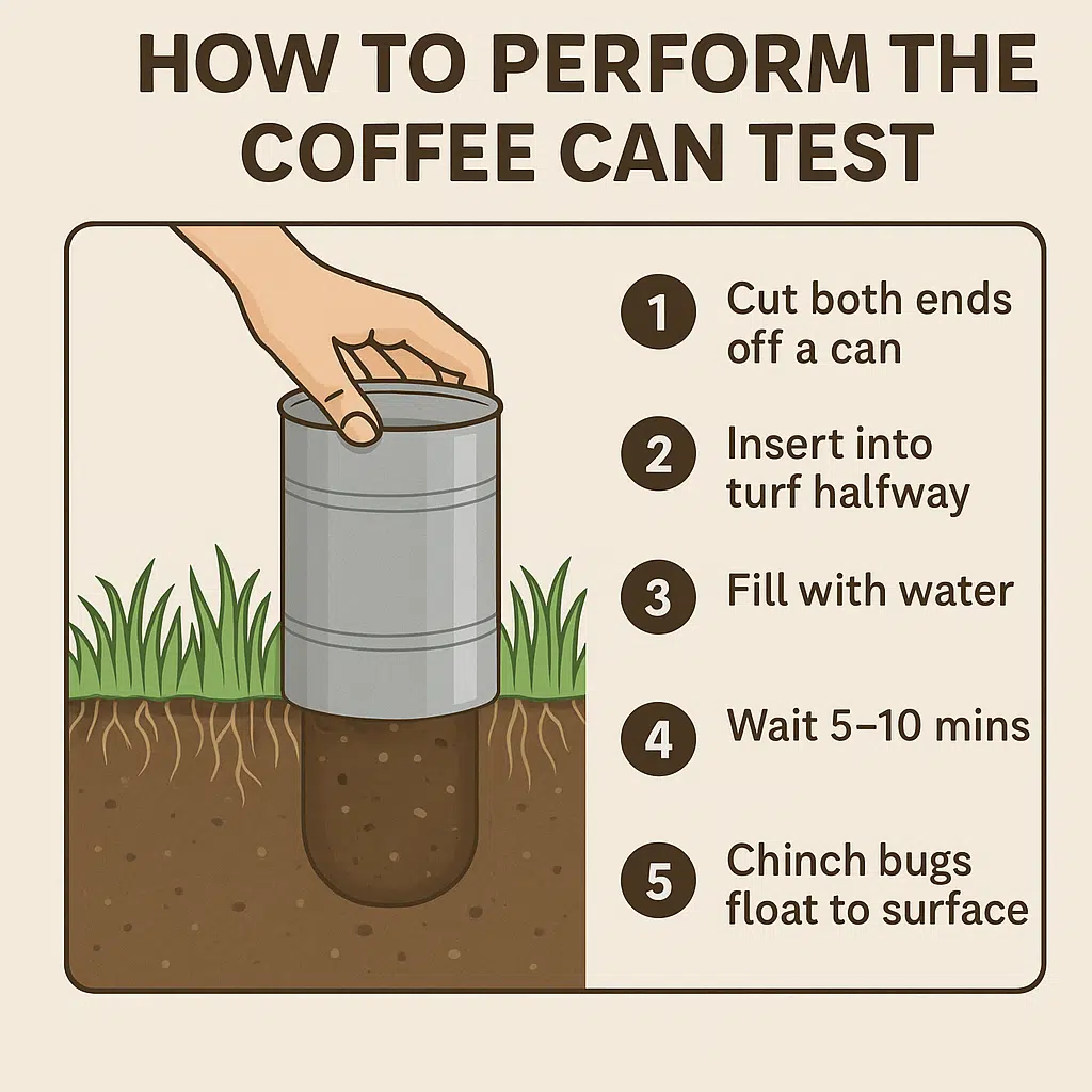 • Coffee can be tested: Insert a bottomless can at the edge of damaged turf, fill with water, and watch for chinch bugs floating up within 5–10 minutes