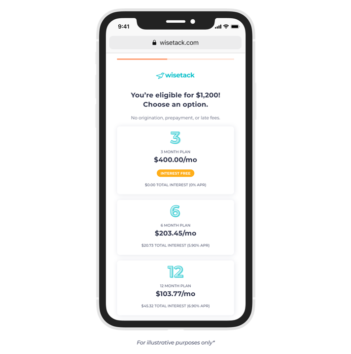 *All financing is subject to credit approval. Your terms may vary. Payment options through Wisetack are provided by our lending partners. For example, a $1,200 purchase could cost $104.89 a month for 12 months, based on an 8.9% APR, or $400 a month for 3 months, based on a 0% APR. Offers range from 0-35.9% APR based on creditworthiness. No other financing charges or participation fees. See additional terms at http://wisetack.com/faqs.