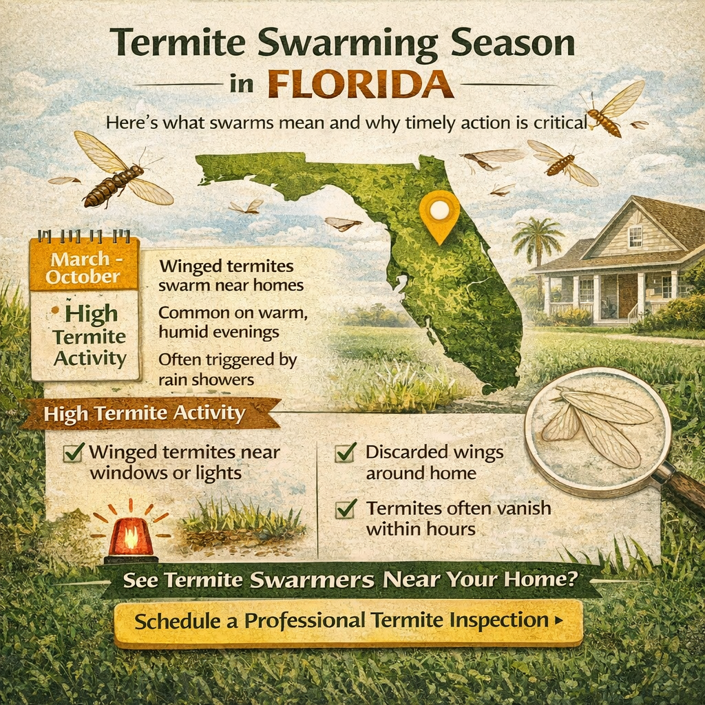This guide explains what termite swarming season means in Florida, when swarms typically occur, why they happen, how to identify termite swarmers, and when professional inspection is critical.